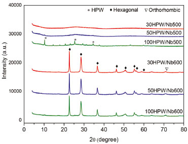 RESULTS AND DISCUSSION Powder X-ray diffraction (XRD) The diffractograms in Figure 1 show that catalysts 30HPW/Nb500 and 50HPW/Nb500 presented amorphous structures, suggesting a good dispersion of HPW over the support, while catalyst 100HPW/Nb500 presented low intensity rays, pointing to the presence of crystalline HPW at 10, 26 and 35º over the support’s surface. Catalysts 30HPW/Nb600, 50HPW/Nb600 and 100HPW/Nb600, on the other hand, presented diffractograms characteristics of niobia with hexagonal structure, due to the change from the amorphous phase to TT-Nb2O5 and/or T-Nb2O5, corresponding to the pseudo-hexagonal and/or orthorhombic structures.47 These results are in accordance with the observations by Jehng and Wachs51 regarding the increase in the degree of crystallinity of the amorphous niobia during the thermal treatment at temperatures in the range of 300 to 1000 ºC, transforming them in more stable phases.51