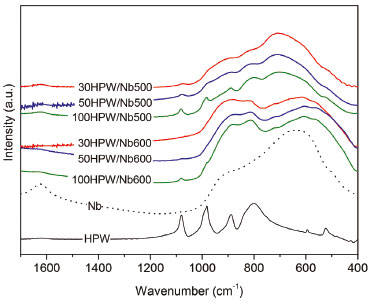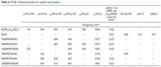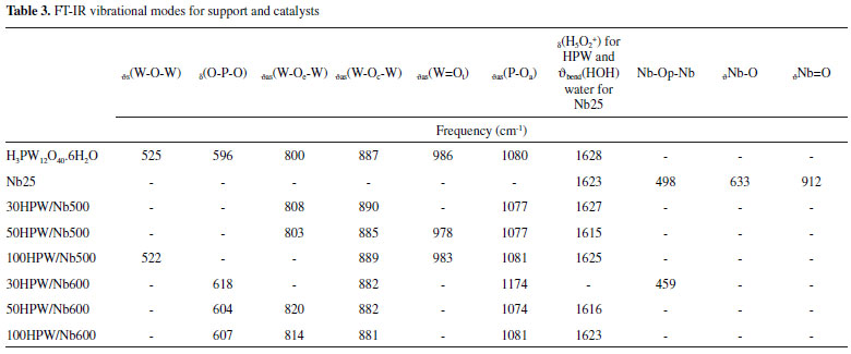FT-IR spectroscopy In the FT-IR studies we performed comparisons in order to verify the influence of content and temperature on the superficial properties of the catalysts. For all analysis pure H3PW12O40.6H2O, treated at 100 ºC, and niobia at 25 ºC (Nb25), were used as references. As shown in Table 3, the HPW presented vibrations in accordance with the results reported by Kozhevnikov et al.52