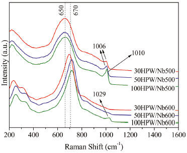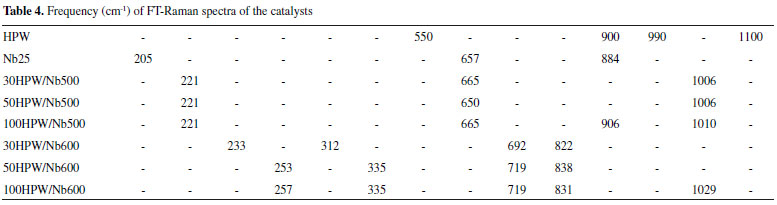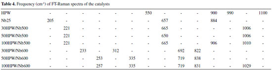 The FT-IR spectra in Figure 2 show that the catalysts calcined at 500ºC were more resistant to the temperature variation, once the shape of the spectra resembles the HPW’s, with a more accentuated interference of the Nb bands between 400-800 cm-1. The peaks corresponding to HPW were more intense for the catalyst 100HPW/Nb500, due to the higher content of HPW. For catalysts 30HPW/Nb600, 50HPW/Nb600 and 100HPW/Nb600, prevailed the bands corresponding to niobia, probably due to the structural change reported before in the DRX analysis (Figure 1). The catalyst 100HPW/Nb600 presented a discrete signal around ~ 1081 cm-1, attributed to the vibration ϑas(P-Oa), analogue to HPW. For both calcination temperatures it was not possible to identify the peak corresponding to the deformation (O-P-O) in the region around 595 cm-1. We believe that this was due to an overlapping of the niobia bands present in the region around 400-600 cm-1 from the vibrations of the type Nb-Op-Nb, in bridge shape.53 Considering that the DRX analysis (Figure 1) has shown the presence of HPW, we believe that there was an overlapping of the FT-IR signals from HPW and niobia. FT-Raman spectroscopy The results obtained through FT-Raman spectroscopy were evaluated by comparing the contents of HPW added to the support and the variation in the temperatures of calcination. The respective spectra and frequencies are presented in Figure 3 and Table 4.