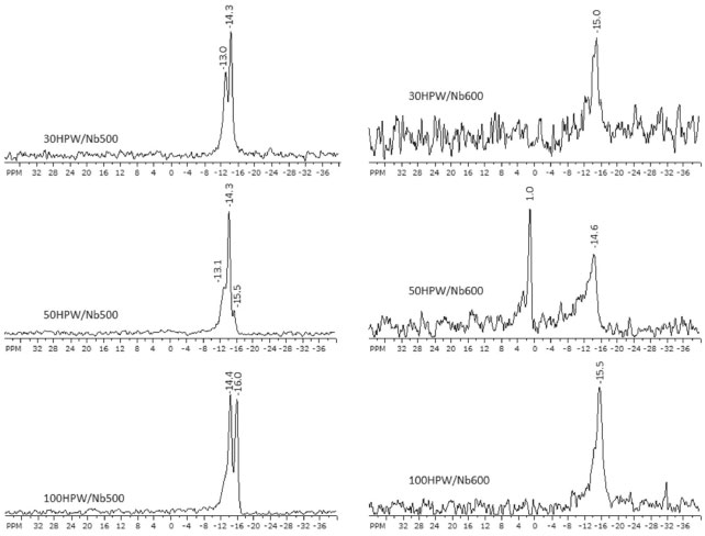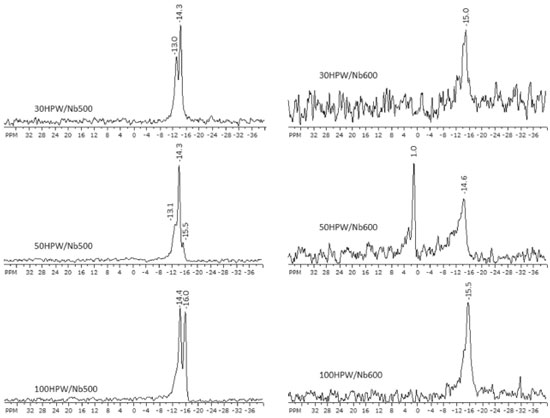 According to the literature43 the FT-Raman spectra of HPW present vibrations related to the respective structural bonds at 1100, 990, 900 and 550 cm-1, corresponding to: P-O stretch, symmetric vibration ϑs(W=Ot), and deformations W-Oc-W and O-P-O, respectively. Figure 3 shows the symmetric vibration ϑs(W=Ot) at ~1006 cm-1, for concentrations 30 and 50% and at ~1010 cm-1 for 100% of HPW content for the samples calcined at 500 ºC. The catalyst 100HPW/Nb500, presented a small shoulder at ~906 cm-1 originated from vibration (W-Oc-W) as also observed by Khder et al.54 The bands between 700-800 cm-1 were not detected, probably because they are overlapped by the support bands in this region. The bands at 220 and 665 cm-1, referring to intact HPW over the support surface, are present in these catalysts. The catalyst 100HPW/Nb600 presented the vibration ϑs(W=Ot) at ~1029 cm-1. This shift related to the former catalysts is probably due to the temperature of calcination. For catalysts 30HPW/Nb600 and 50HPW/Nb600, it was not possible to detect, through the Raman spectra (Figure 3), the signals related to the presence of HPW. The FT-Raman spectra presented also the characteristic bands of niobia with absorption between 850-1000 cm-1, corresponding to the octahedral structure of NbO6 highly distorted with bonds Nb=O terminals.55,56 The bond Nb-O present in the region around 500-700 cm-1, belongs to the octahedral structure slightly distorted of NbO6. This bond is also present in species NbO7 and NbO8.56 According to Jehng and Wachs51 the bands between 400-800 cm-1 are attributed to the symmetric and asymmetric stretching modes of the bonds Nb-O-Nb, and its associated deforming modes show up in the region of low wave length, between 200-300 cm-1. We believe that the signal around ~180 cm-1 has been shifted due to the presence of HPW. According to Janik et al.,57 HPW loses crystallization water at low temperatures (<200ºC). From this temperature over, the water lost is due to the deprotonation of the acid. So, at 600ºC, probably the species present in the solid are Nb2O5, WO3 and P2O5. As in the FT-IR study (Figure 2), it was not possible to detect the signal ϑs(W=Ot), which confirms the presence of HPW, for the catalysts 30HPW/Nb600 and 50HPW/Nb600 in the FT-Raman spectra (Figure 3). 31P MAS NMR According to Kumar et al.,40 an appropriate and very efficient method to elucidate the structure and check the stability of HPW is the solid state 31P NMR spectroscopy, once features like purity and degree of hydration change in the environment around the transition metal central atom and formation of [≡M–OH2]n + [H3–n]n-3 species are due to interactions between the support and the HPW. Our 31P MAS RMN results confirmed the presence of HPW over the support, suggesting that our impregnation method was efficient. In the 31P NMR spectra, presented in Figure 4, it’s possible to see that, except for catalysts 30HPW/Nb600 and 100HPW/Nb600, there are 2 different chemical environments for 31P. In the spectra for catalysts calcined at 500 °C and for catalyst 50HPW/Nb600, there is the signal around –14.3 ppm, suggesting that the HPW is strongly adsorbed to the support, due to the enlargement of the peak between the HPW species, finely dispersed over the support.58