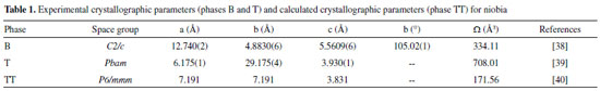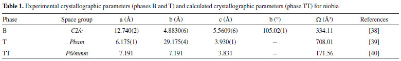 EXPERIMENTAL Impregnation and heat treatment Niobium oxide hydrated, Nb2O5.xH2O, code HY340, provided by CBMM (Brazilian Society of Mining and Metallurgy), was used as support for the impregnation of the catalysts. The impregnation was made on the support with previous calcination at 500 °C and 600 °C for 2 h at 2 °C min-1 under N2 flow. Before impregnation, the catalyst was maintained at 80 °C for 1 h in a rotary evaporator. Then, the systems were cooled to room temperature and the required amount of aqueous solution containing 30%, 50% and 100% of H3PW12O40.nH2O (Sigma-Aldrich) was added dropwise, under constant stirring. After impregnation, the catalysts were maintained under agitation for 1 h and, then, frozen during 24 h and freeze-dried following the same procedure adopted before in a former work.45 The catalysts were named 30HPW/Nb500 and 30HPW/Nb600 for the catalysts with 30% HPW supported on niobia calcined at 500 and 600 °C, respectively; 50HPW/Nb500 and 50HPW/Nb600 for the catalysts with 50% HPW supported on niobia calcined at 500 and 600 °C, respectively; and 100HPW/Nb500 and 100HPW/Nb600 for the catalysts with 100% HPW supported on niobia calcined at 500 and 600 °C, respectively. Characterization The surface areas were determined through N2 adsorption. Samples were desorbed in cell BET under vacuum at 150 °C for 5h with a ramp of 5 °C/min and analyzed in ASAP 2020 from Micromeritics, V1.05 G unit 1. The X-ray diffraction (XRD) patterns in θ-2θ of the samples, without previous treatment, were performed on a Siemens diffractometer using radiation Cu Kα at room temperature. Infrared (FTIR) were recorded with a Bruker Vector 22 spectrophotometer. The samples were mixed with dried KBr, forming pellets containing 1 wt% and the spectra were taken with 32 scans at 4 cm-1 of resolution. For FT-Raman we used a Linkam TS1500 cell spectrophotometer. The spectra were recorded under ambient conditions, with 128 scans, wavelength of 514nm and a 50x objective. The 31P MAS-NMR spectra were acquired using a spectrometer Bruker DSX400 equipped with a standard 4 mm triple resonance probe H-X-Y. The spinning rate was typically 10 KHz and the repetition time was 60s. The samples were analyzed without pretreatment. Theoretical studies This theoretical investigation aimed to analyze the influence of the increased calcination temperature on HPW adsorption, and examine which factors are involved. Above the calcination temperatures, in which crystal structures of Nb2O5 are found, three phases were selected to perform the theoretical calculations: phase TT and T (from 450 °C to 600 °C), and phase B (800 °C). These Nb2O5 phases were chosen to perform the calculation procedures due to the availability of crystallographic parameters which allowed for the construction of the model. The goal of this investigation was to evaluate the change in the adsorption behavior with increasing the temperature of calcination of the material on the catalysts modeling, considering the influences of hydrogen atoms on the surface of the support in the HPW adsorption. For the construction of the calcined niobia the crystallographic parameters shown in Table 1 were employed.
