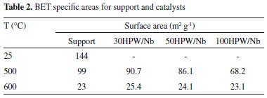Surface area (BET) determination As can be seen in Table 2, the increase in the calcination temperature lead to a gradual reduction of the specific areas for both support and catalyst. For niobia this reduction was probably caused by the increase in crystallinity due to the phase change from the amorphous oxide to its crystalline phases with hexagonal or orthorhombic structures, as discussed before. For the catalysts, we believe that this reduction in specific area was provoked by the presence of HPW, as well as the variation on its content in the catalysts, besides the increase in the calcination temperature.