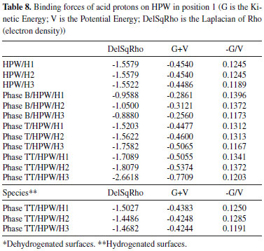 Hydrogenated phases are characteristic of a treatment with a milder temperature, generating amorphous phases. According to the experimental values, mild treatments resulted in a better HPW adsorption, and this tendency is confirmed by means of our theoretical procedures. Once the HPW adsorption on the surface of hydrogenated TT-Nb2O5 phase happens, our findings point out lower energy values than those without the presence of hydroxyl groups. Keeping in mind that the HPW adsorption on the catalyst surface is preferably in position 1, AIM calculations were performed in this system in order to assess the influence of the support on the acid character of the HPW hydrogens. The computed results by using the AIM methodology are described in Table 8. It is important to notice that for ionic character: DelSqRho > 0; –G/V > 1; G+V > 0 and for covalent character: DelSqRho < 0; –G/V < 1; G+V < 0. The more pronounced ionic character in the O-H bond of HPW is related to the higher acidity of this compound.