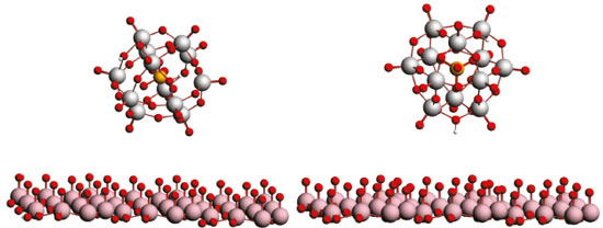Figure 5. Illustration of the HPW adsorption on the TT-Nb2O5 phase in position 1 (left): Nb2O5/HPW (pos1), and position 2 (right): Nb2O5/HPW (pos2). Red: oxygen, pink: niobium, gray: tungsten, orange: phosphorus, white: hydrogen