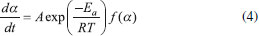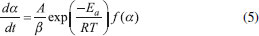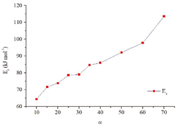 Matematicamente, a regressão linear das retas correspondentes as perdas em massa da amostra obtiveram coeficientes de correlação linear no intervalo de 0,997 - 0,999 (Tabela 2), o que corrobora sobre a respeito da precisão dos dados obtidos na termogravimetria. A Figura 4 trata do mecanismo cinético de decomposição do material, em que se observa o paralelismo entre as retas, indicando que as energias de ativação são próximas em diferentes conversões e, consequentemente, implica a possibilidade de um único mecanismo de reação (ou a unificação de múltiplos mecanismos de reação). Portanto, presume-se que ocorre apenas uma forma de quebra molecular. Isto garante que se houver quebra, os produtos desta decomposição serão sempre os mesmos.39,40 O valor para a Ea em FWO variou de 63,54 a 112,3 kJ mol-1. Desse modo, foi traçada a curva de Ea em função de α (Figura 5) para prever o valor máximo de Ea necessário à reação de decomposição térmica da amostra.