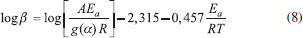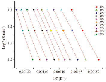 ![]() Figura 4. Logaritmo da razão de aquecimento em função do inverso da temperatura para as percentagens de perda em massa “α” fixada para o GFN 2A