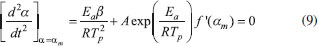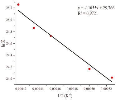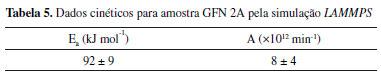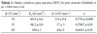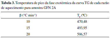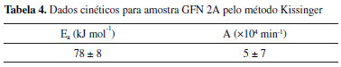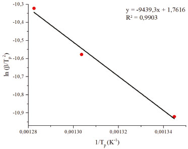Com os dados da Tabela 3 foi gerada a curva ln (β/Tp2) × 1/Tp (Figura 6) e a partir da regressão linear obtém-se os parâmetros cinéticos da energia de ativação e o fator pré-exponencial da amostra GFN 2A, apresentados da Tabela 4.