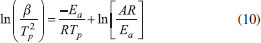 Na Figura 5, observa-se que energia de ativação (Ea) variou de 64 a 114 kJ e que os valores máximos são apresentados no final do processo de decomposição (Figura 5). Ainda é possível notar certa dependência da Ea com o grau de conversão (α), indicando também a possibilidade da graxa PFPE decompor-se em um único mecanismo de reação. Método de Kissinger No método de Kissinger foi considerada a temperatura de pico da fase exotérmica de decomposição (Tp) da amostra da graxa lubrificante a base de PFPE, medida a partir de cada razão de aquecimento correspondente as principais etapas da decomposição térmica. Os dados são apresentados na Tabela 3.