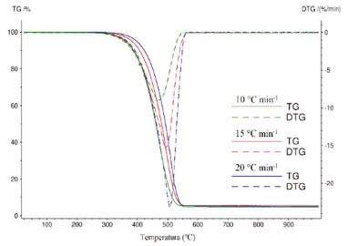 ![]() Figura 2. Curvas TG e DTG de amostras de GFN 2A relacionando as percentagens de conversão em massa utilizada para o estudo cinético do material. Condições da análise: Massa inicial da amostra de 10mg, atmosfera de ar sintético (100 mL min-1)