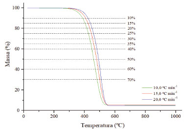 Método de Flynn-Wall-Ozawa Numa segunda etapa, aplicou-se o método cinético de FWO para curvas TG e foram determinadas a Ea e A com base na norma ASTM E1641-16.38 Foram coletados dados de perda de massa em função da temperatura (α) de 10,0%; 15,0%; 20,0%; 25,0%; 30,0%; 35,0%; 40,0%; 50,0%; 60,0% e 70,0% (Figura 3). A partir dos valores obtidos, foram plotadas as curvas do log β (razão de aquecimento) versus 1/T (Figura 4), da inclinação angular das curvas. O método cinético empregado permitiu a determinação dos valores da Ea e A. Portanto, os parâmetros cinéticos foram determinados considerando-se toda faixa de temperatura de degradação térmica da amostra, conforme os resultados apresentados na Tabela 2.