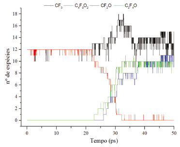 ![]() Figura 7. Simulação da decomposição térmica do PFPE realizada no LAMMPS. Condições da análise: Faixa de temperatura 0 a 3500 K, processo de 50 ps sob atmosfera de ar sintético