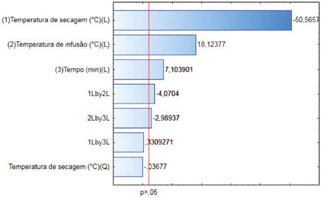 Alguns trabalhos relatam que solventes com alta polaridade como a água podem resultar em extratos com impurezas, como ácidos orgânicos e açúcares redutores, os quais podem ter influência na determinação dos compostos fenólicos.21 Os extratos aquosos de folhas de amoreira preta apresentaram baixas concentrações de açúcares redutores (0,03 ± 0,01 mg g-1). Dessa forma, considera-se que a influência dos açúcares redutores sobre a concentração dos compostos fenólicos não foi significativa. Os experimentos 3 e 7 apresentaram os maiores conteúdos fenólico total, submetidos a menor temperatura de secagem (50 °C), maior temperatura de infusão (96 °C) e tempos de infusão de 10 e 30 minutos respectivamente. Com o Gráfico de Pareto (Figura 1) é possível uma melhor compreensão visual do comportamento do CFT em relação às variáveis independentes e suas interações. A linha em vermelho indica a região onde as variáveis devem alcançar para demonstrar significância estatística.