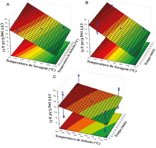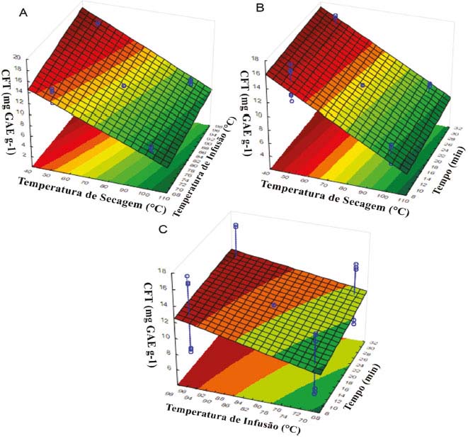 Figura 2. Gráficos de superfície de resposta para conteúdo fenólico total em função de: Temperatura de secagem versus Temperatura de infusão (A); Temperatura de secagem versus Tempo (B); Temperatura de infusão versus Tempo (C)