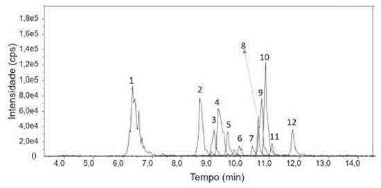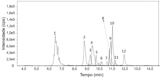 Figura 3. Cromatograma das análises de LC-ESI-MS/MS em extratos de folhas de amoreira preta. Numeração dos sinais: 1, ácido protocatecuico; 2, ácido 4-hidroximetilbenzóico; 3, Ácido clorogênico; 4 ácido cafeico; 5, ácido vanílico; 6, ácido siríngico; 7, ácido p-cumárico; 8, ácido ferúlico; 9, umbeliferona; 10, quercetina; 11, ácido salicílico; 12, ácido elágico