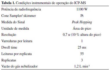 Para o preparo das amostras utilizou-se de 0,3 g de folhas secas, pesadas diretamente em frascos de politetrafluoretileno (PTFE), após a adição de 4,0 mL de ácido nítrico e 2,0 mL de peróxido de hidrogênio, e levadas à digestão em forno micro-ondas modelo DGT 100 Plus (Provecto Analítica) a 600 W. Posteriormente foram avolumados para 30 mL e diluídas adequadamente para análise por ICP-MS. A determinação de K foi realizada em fotômetro de chama modelo 610 MS (Analyser). Potência de radiofrequência 1100 W Cone Sampler/ skimmer Pt Medida do Sinal Peak Hopping Unidade de medida Área do pico Resolução 0,7 u (10 % altura do pico) Varreduras por leitura 1 Dwell time 25 ms Leituras por replicata 55 Replicatas 3 Vazão do gás nebulizador 1,2 L min-1 Análise estatística A análise estatística foi realizada utilizando os softwares Sasm-Agri, Origin® 8 e Statistica versão 10 (Statsoft, Tulsa, OK, EUA). Os resultados obtidos foram submetidos à análise de variância (ANOVA), assumindo p<0,05 (5%) seguida de comparação de médias pelo teste Tukey (p < 0,001).