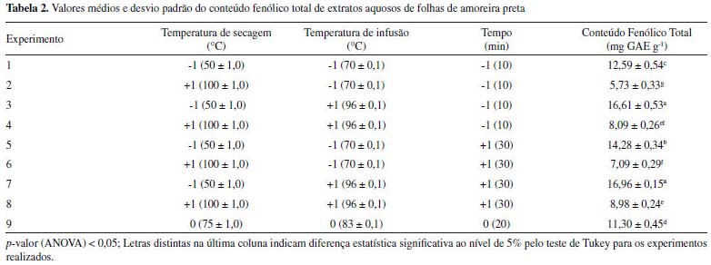 RESULTADOS E DISCUSSÃO Otimização da extração por infusão A extração dos compostos fenólicos das folhas da amoreira preta foi realizada por meio de uma otimização multivariada onde a temperatura de secagem das folhas, temperatura e tempo de infusão foram avaliadas. As concentrações de CFT, em relação às variáveis independentes temperatura de secagem, temperatura de infusão e tempo de extração estão apresentadas na Tabela 2. Observa-se que houve diferença estatística (p<0,001) entre os experimentos que compõem a matriz experimental, realizados com a mesma amostra, as concentrações de CFT obtidas variaram de 16,96 ± 0,15 a 5,73 ± 0,33 mg GAE g-1. A literatura traz alguns estudos sobre a Morus nigra, entretanto, não foram encontrados trabalhos de avaliação dos compostos fenólicos totais após extração com água nestes moldes de análise. Resultados semelhantes foram reportados por outros autores que encontraram em folhas de Morus nigra coletadas na Espanha, estudo em que utilizou a extração assistida por ultrassom e metanol aquoso acidificado com éter, resultando em valores de CFT entre 13,48 ± 0,46 e 16,13 ± 0,55 mg GAE g-1.20