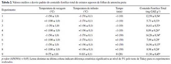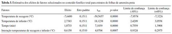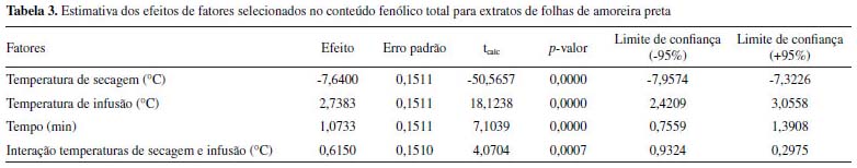 Pode se observar que a temperatura de secagem, temperatura de infusão e tempo foram significativas para o conteúdo fenólico total, assim como as interações entre a temperatura de secagem das folhas e a temperatura de infusão, como também entre temperatura de infusão e o tempo de extração. A Tabela 3 fornece resultados sobre os efeitos das variáveis e os coeficientes de regressão e assim é possível verificar se os fatores (variáveis independentes) foram significativos.