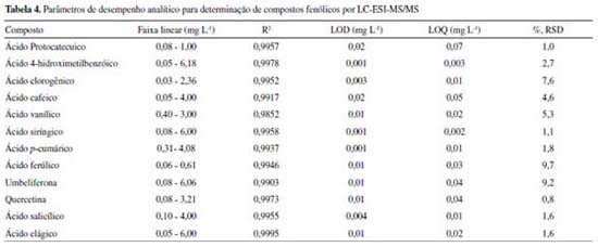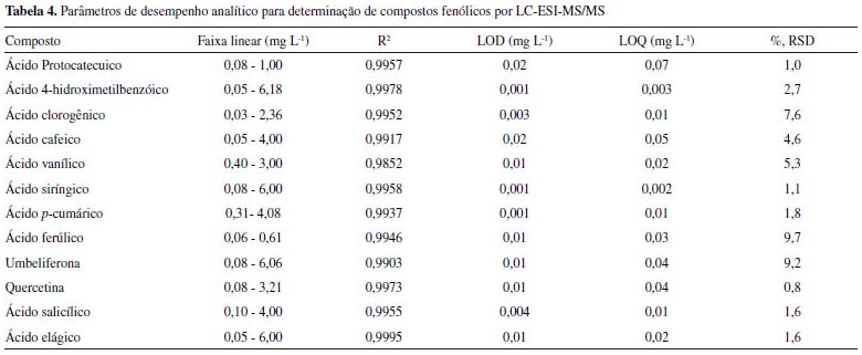 Analisando as superfícies de resposta é possível observar que todos os gráficos apresentaram inclinação ascendente, as regiões ótimas de extração estão localizadas onde se obtém as maiores concentrações de CFT. Como não foi observada uma curvatura significativa, procura-se a condição em direção da região ótima de extração. A realização de novos experimentos, deslocando os experimentos em direção à condição ótima não é possível, já que a temperatura máxima de extração é limitada pelo banho ultratermostático e além disso o objetivo deste estudo é simular o preparo natural e caseiro de uma infusão das folhas de amoreira preta. Conforme pode ser observado, a temperatura de secagem foi a variável independente (fator) que obteve maior significância dentre os três fatores analisados, sendo que a sua significância é atribuída à condição -1, que se refere à utilização da temperatura de secagem das folhas a 50 °C. A temperatura de infusão foi a segunda variável independente (fator) que obteve maior efeito e a sua significância é atribuída à condição +1, demonstrando que é mais significativo utilizar uma temperatura de infusão a 96 °C do que 70 °C, que no caso deste estudo, foi a matriz que apresentou maior percentual de conteúdo fenólico total. Embora o tempo tenha se mostrado significativo estatisticamente, seu efeito é muito menos pronunciado do que o efeito dos dois outros fatores principais, sendo que um menor tempo implicaria em menor gasto de energia. Recentemente, Casagrande et al.,24 ao investigarem a influência da temperatura de extração no conteúdo fenólico total em alecrim do campo, observaram que ao aumentar a temperatura de extração de 40 para 80 °C resultou em um aumento de 50% no CFT. Rajha et al.,25 por meio de um planejamento fatorial para otimizar a extração etanólica em amostras de uvas, alcançaram maior quantificação de CFT a temperatura de extração de 94 °C. As condições ótimas de extração dos CFT foram: temperatura de secagem a 50 °C, temperatura de infusão a 96 °C por um tempo de 10 minutos. Estas condições foram adotadas para obtenção dos extratos e para posterior análise. Composição química e atividade antioxidante dos extratos de amoreira preta Para os extratos obtidos nas condições ótimas, as concentrações de flavonoides totais, flavonóis totais, capacidade redutora total e capacidade antioxidante foram determinadas. Os resultados obtidos indicam que as concentrações de flavonoides totais foram de 4,01 ± 0,16 mg CAE g-1, sendo esses semelhantes aos relatados na literatura. Thabti et al.26 constataram concentrações de flavonoides totais de 1,93 a 3,98 mg RE g-1 (Equivalente de Rutina) em folhas de diferentes espécies de amoreira com extração água/metanol (1:1, v / v) em banho maria a 80 °C por 15 minutos. A concentração de flavonóis totais nos extratos de folha de amoreira preta foi de 2,67 ± 0,13 mg QE g-1. Até agora, nenhuma espécie de amoreira preta teve dados reportados para a concentração total de favonóis. Os valores encontrados para a capacidade redutora total e IC50 foram de 27,69 ± 0,46 mg QE g-1 e 0,94 ± 0,12 mg mL-1 respectivamente. Resultados semelhantes foram registrados por uma pesquisa em que se observaram valores de atividade antioxidante em extratos aquosos de folhas de amoreira preta de IC50 de 1,25 mg mL-1.27 Essa capacidade antioxidante em extratos aquosos de folhas de Morus nigra tem sido demonstrada em estudos in vivo. Um estudo verificou os efeitos causados por uma dose de 400 mg kg–1 dia–1 ofertada a ratas Wistar grávidas diabéticas e não diabéticas. Além de apresentarem redução nas taxas de colesterol total, colesterol LDL (low density lipoproteins) e triglicerídeos, foi observado também que a oferta do extrato aquoso elevou os níveis sanguíneos da enzima superóxido dismutase, demonstrando que os extratos aquosos das folhas de amoreira preta apresentam ação antioxidante.28 Análise de compostos fenólicos de extratos por LC-ESI-MS/MS Parâmetros de desempenho analítico para análise A faixa linear, o coeficiente de determinação (R2), os limites de detecção (LOD) e quantificação (LOQ) e desvio padrão relativo (RSD) obtido para a determinação dos compostos fenólicos por LCESI-MS/MS são apresentados na Tabela 4.