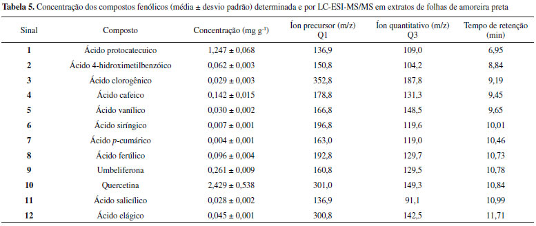 Coeficientes de determinação maiores do que 0,99 foram obtidos, exceto para o padrão ácido vanílico, indicando boas correlações entre as concentrações dos compostos investigados e as áreas das bandas, no intervalo de concentração da curva analítica. O limite de detecção é definido como a menor concentração do composto que está sendo analisado e que pode ser detectado, mas não necessariamente quantificado pelo método experimental, já o limite de quantificação é caracterizado como a menor concentração do composto sob as condições experimentais estabelecidas que pode ser quantificado.19 A precisão do método proposto foi avaliada por meio do desvio padrão relativo (RSD), o qual apresentou resultados entre 0,8% a 9,2%, demonstrando uma boa precisão. Perfil fenólico dos extratos de amoreira preta Os compostos fenólicos presentes nos extratos de folhas amoreira preta também foram identificados e quantificados por LC-ESI-MS/MS. As concentrações dos compostos, os íons precursores juntamente com o tempo de retenção estão descritos na Tabela 5 e cromatogramas Figura 3.