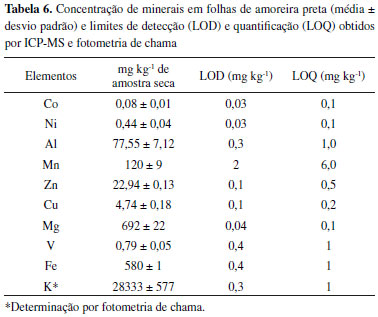 Outros derivados do ácido benzóico foram encontrados nos extratos foliares da amoreira preta, como os ácidos vanílico, siríngico, 4-hidroximetilbenzoico, salicílico e elágico em menores concentrações, além dos ácidos p-cumárico e clorogênico, que são derivados do ácido cinâmico. Os ácidos clorogênico, vanílico, siríngico e p-cumárico já haviam sido relatados na literatura como constituintes em folhas de Morus nigra.27,30,31 Em contrapartida, os ácidos 4-hidroximetilbenzoico, salicílico e elágico não foram mencionados para esta espécie em trabalho científico até o momento. O composto umbeliferona (9), com concentração de 0,261 ± 0,009 mg g-1, destacou-se por ser a terceira substância em maior concentração, sendo a primeira vez que a umbeliferona é relatada em folhas da espécie de Morus nigra L. Dugo et al.,32 em seus estudos com extratos etanólicos de folhas de Morus alba obtidos por maceração utilizando sistema de HPLC acoplado a um espectrômetro de massas, também identificaram essa molécula. A umbeliferona é uma cumarina, e essa, por sua vez, é um metabólito fenólico, sintetizada principalmente por plantas, podendo fornecer defesa contra patógenos e atuando na regulação do estresse oxidativo e hormonal.33 Diversas ações biológicas são atribuídas a esses compostos, tais como atividade antifúngica, atenuação de danos renais e propriedades antioxidantes.34,35 Determinação de minerais nas folhas de Morus nigra As concentrações de minerais nas folhas de Morus nigra e os limites de detecção (LOD) e quantificação (LOQ) obtidos por ICP-MS estão apresentados na Tabela 6. O LOD na ordem de mg kg-1 foi calculado considerando 3 vezes o desvio padrão de dez leituras do branco da amostra dividido pelo valor da inclinação da curva. Os valores obtidos de LD variaram entre 0,03 e 2 mg kg-1, demonstrando que a sensibilidade do método proposto é adequada. Para os limites de quantificação (LOQ) os cálculos são definidos como 3,3 vezes o LOD. Os valores para o desvio padrão relativo (RSD) em todos os elementos apresentaram-se menores que 10%, indicando boa precisão do método. A faixa linear foi de 1 a 200 μg L-1 para todos os elementos exceto para K, determinado por fotometria de chama, neste caso o equipamento é calibrado com solução padrão de 100 mg L-1. As determinações foram realizadas em triplicata e os resultados são expressos como média ± desvio padrão. Entre os elementos microminerais determinados, cobre (Cu), ferro (Fe), zinco (Zn), cobalto (Co), vanádio (V), níquel (Ni), alumínio (Al) e manganês (Mn), as concentrações mais altas foram encontradas para e Fe com 580 ± 1 mg kg-1. Já em relação aos nutrientes necessários a saúde em maior concentração, os macrominerais, potássio (K) e magnésio (Mg) e apresentaram concentrações de 28333 ± 577 e 692 ± 22 mg kg-1, respectivamente, sendo o potássio o elemento predominante entre todos os elementos analisados. Yigit et al.,36 ao avaliarem a concentração mineral de folhas de Morus nigra coletadas em certa região da Turquia, usando um método de fluorescência por raios X, constataram valores de potássio de 15902,1 ± 213,0 ppm (mg kg-1). Entretanto, essas concentrações podem variar de acordo com diferentes de espécies, práticas agrícolas, região, condições de solo e clima. O potássio é indispensável ao organismo humano, pois participa do equilíbrio ácido-base, balanço hídrico, bomba sódio-potássio, age na conversão da glicose em glicogênio e na condução de impulsos nervosos.37 A concentração de magnésio apresentou 692 ± 22 mg kg-1, superior ao reportado para folhas de Morus alba em um estudo de variação sazonal, onde foram relatadas concentrações de magnésio de 4,4 a 4,8 mg kg-1 de matéria seca.38 A concentração observada neste estudo demonstra que os extratos de amoreira preta podem ser uma fonte abundante de magnésio. A recomendação de ingestão diária de magnésio é de 310 a 320 mg para homens e 400 a 420 mg para mulheres.39 O consumo de aproximadamente 58 g ao dia de folhas de amoreira preta poderia suprir 10% da ingestão diária recomendada para magnésio. Uma ocorrência bastante oportuna investigada nos extratos foliares de amoreira preta é a concentração de ferro ser bem maior que a concentração de manganês, pois estudos indicam que o ferro e o manganês competem pelos mesmos transportadores sistêmicos. Além disso, quando a concentração de manganês é superior, essa pode levar a um desequilíbrio homeostático de ferro no organismo.40 Investigações sobre a composição mineral de frutos de Morus nigra por espectrometria de absorção atômica revelaram concentrações de zinco e cobre de 32 e 4 mg kg-1 respectivamente, concentrações semelhantes aos avaliados neste estudo.41