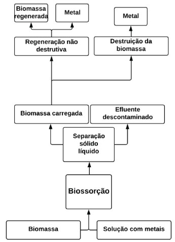 ![]() Figura 3. Representação da biossorção de metais por meio da utilização de biomassa. Adaptada da ref. 27
