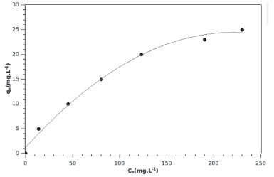 Adsorção A adsorção é um processo no qual determinada substância, seja ela gasosa, líquida ou sólida, fica ligada sobre a superfície do material adsorvente sólido. Essa adesão das moléculas pode ocorrer tanto por forças químicas quanto físicas, sendo que a capacidade de adsorção depende de diversos fatores físico-químicos, como área superficial, temperatura, pH, agitação.32 Assim, como os componentes adsorvidos ficam dispostos na superfície externa do adsorvente, quanto mais extensa for a superfície externa em relação a unidade de massa sólida, mais favorável será à adsorção.33 A temperatura, por sua vez, atua na adsorção principalmente em relação à constante de velocidade de reação, sendo que o aquecimento acentua a energia cinética, a mobilidade dos componentes do adsorvato, bem como a difusão intrapartícula do componente a ser adsorvido. Outro ponto a ser levado em consideração em relação à influência da temperatura é que a elevação da mesma pode promover a desobstrução de poros internos do adsorvente, promovendo o aumento da área superficial e à entrada de moléculas maiores no interior do material.34 O pH irá determinar o grau de distribuição das espécies químicas, sendo a intensidade do efeito diretamente dependente do adsorvente, pois as cargas superficiais variam conforme a composição do material. Assim, o pH será o fator que irá determinar a carga da superfície do material adsorvente, além de ser decisivo entre as interações eletrostáticas entre o adsorvato e o adsorvente.33 A agitação poderá, assim como a temperatura, acentuar a mobilidade das espécies de adsorvato, favorecendo o processo de adsorção.35 No momento que o adsorvato, um composto presente em solução líquida ou gasosa, entra em contato com o adsorvente, um material sólido, o processo de adsorção irá ocorrer até que o equilíbrio seja estabelecido, ou seja, até que a concentração do adsorvato permaneça constante na solução em que se encontra. Por meio da determinação do ponto em que o equilíbrio é estabelecido, levando em consideração massas diferentes de material adsorvente, é possível construir isotermas de adsorção, como a representada pela Figura 4.33