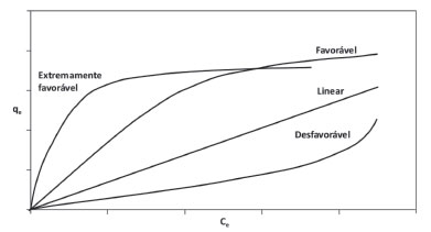 em que Ce representa a concentração de adsorvato presente na solução após a adsorção atingir o equilíbrio, e qe é referente a capacidade de adsorção do material adsorvente. Por meio das isotermas é possível obter gráficos variados, que podem ser analisados em função da adsorção ocorrer de forma favorável ou desfavorável, como representado na Figura 5.33