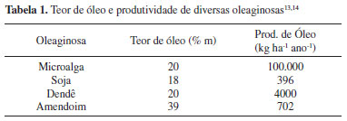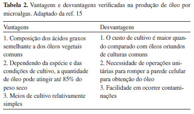 O metanol é o álcool mais utilizado na obtenção de biodiesel, tendo o porém de ser obtido por meio de fontes fósseis. Para um biodiesel completamente renovável, o uso de etanol deve ser feito, mas esse apresenta algumas desvantagens em comparação ao metanol, como a lentidão e maior complexidade no processo.16 O crescimento microalgal, com a consequente produção de óleo, pode ser muito bem associada com estações de tratamento de esgotos (ETE), sendo capazes de realizar um papel muito efetivo em relação a remoção de nutrientes, que as microalgas utilizam para seu crescimento e propagação, gerando ao mesmo tempo compostos que podem ser inseridos em inúmeros processos.17 Levando em consideração apenas a produção de óleo pelas microalgas, a Tabela 2 retorna as principais vantagens e desvantagens já constatadas.
