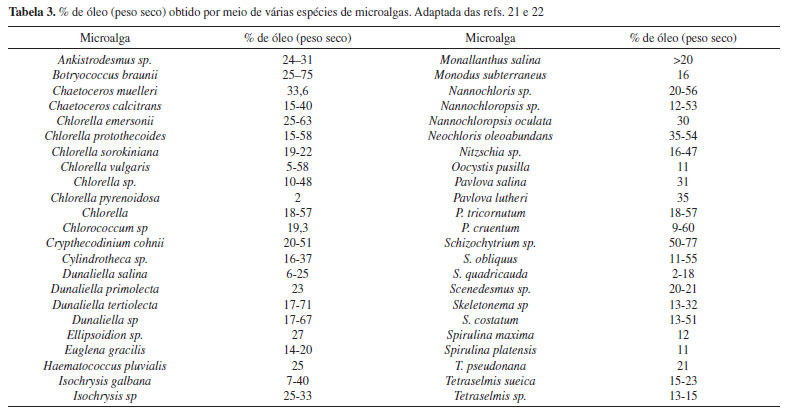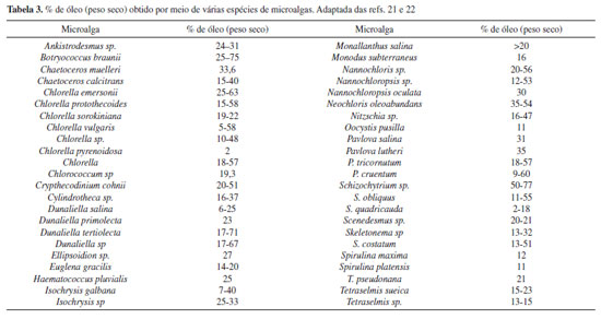 Dentre os compostos produzidos pelas microalgas, os ácidos graxos são alvo de uma grande gama de estudos, principalmente em função da aplicação dos mesmos na produção de biodiesel, resultante do fato das grandes quantidades de lipídeos que algumas espécies são capazes de produzir, como pode ser verificado na Tabela 3. Esses microrganismos fotossintéticos sintetizam ácidos graxos por meio de fontes de carbono (como CO2) ou diretamente de fontes orgânicas como glicose ou acetato.18