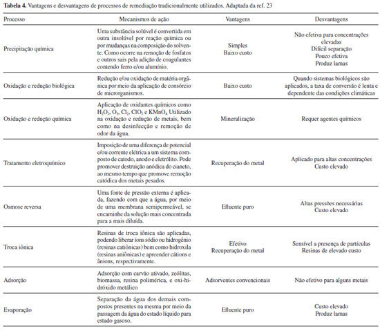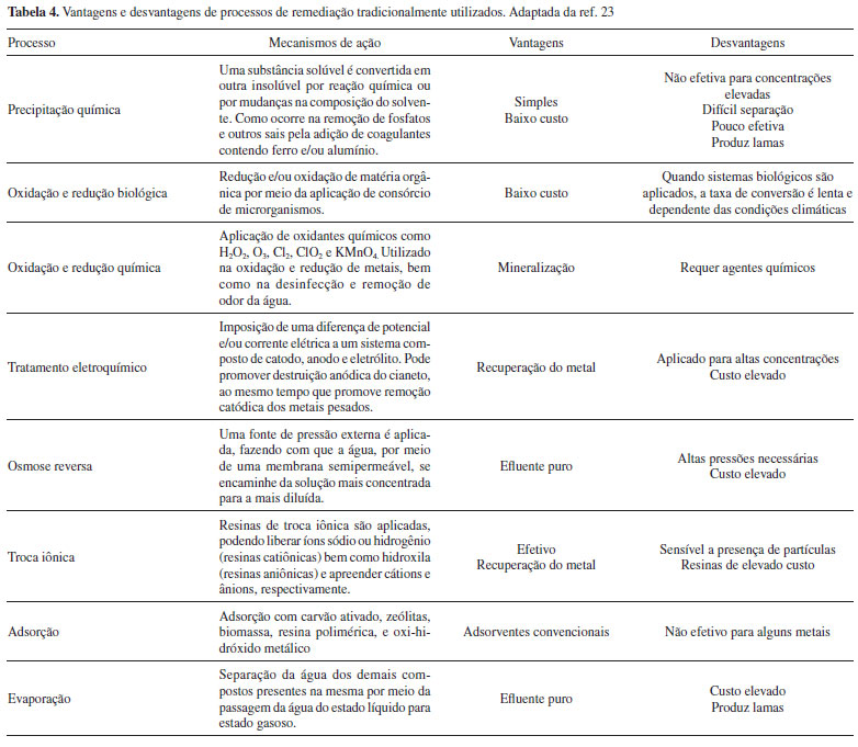 EFLUENTES CONTAMINADOS A contaminação de cursos d'água por meio de efluentes domésticos e industriais é um grave problema ambiental, uma vez que pode inviabilizar a utilização da água, recurso necessário para a manutenção da vida. Sendo composta por substâncias orgânicas e inorgânicas, a poluição pode ser definida como química, física ou biológica, alterando determinado ciclo biológico.8 Quando se trata da poluição de recursos hídricos, o problema atinge grandes contingentes, uma vez que a dispersão dos compostos poluentes pode se dar forma extremamente rápida. Dentre os compostos contaminantes que podem ser dispersos nos recursos hídricos, os metais são preocupantes, uma vez que não são degradados física ou biologicamente, ciclando, portanto, entre os diversos compartimentos ambientais.8 No âmbito industrial, os métodos tradicionalmente utilizados na descontaminação de efluentes são: precipitação química e filtração, oxidação e redução biológica, oxidação e redução química, tratamento eletroquímico, osmose reversa, troca iônica, adsorção e evaporação. As vantagens e desvantagens de cada método estão dispostas na Tabela 4. De uso muito comum, a troca iônica e a adsorção com carvão ativado são eficientes, mas relativamente caras, isso devido aos custos com operação e equipamentos.23