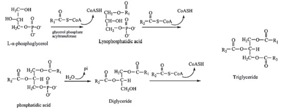 As microalgas, assim como plantas e animais, são capazes de biossintetizar triglicerídeos como forma de armazenamento energético, sendo o L-a-fosfoglicerol e acetil-coA os principais primers aplicados na biossíntese de triglicerídeos, cujos mecanismos de síntese podem ser visualizados na Figura 1.15