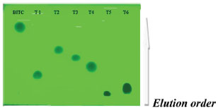 ![]() Figure 2. Image of the thin-layer chromatography run (20% ethyl acetate in hexane, λ = 254 nm) of thioureas (T1-T6, see Table 1) instantly prepared at room temperature with BITC extracted from papaya seeds