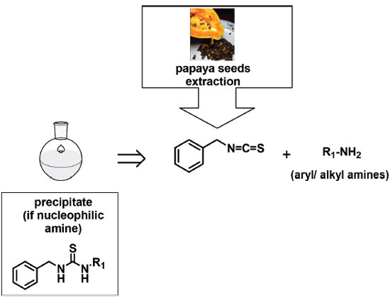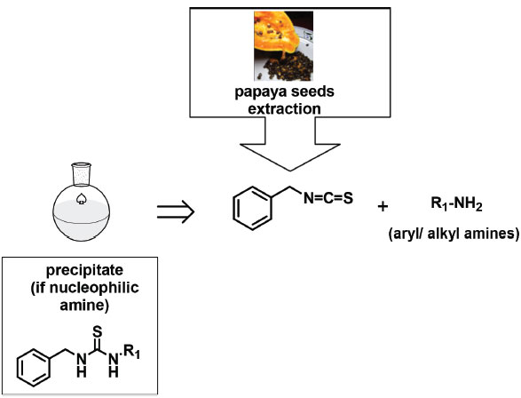 Double-bond nucleophilic addition reactions are among some of the first reactions covered in an introductory organic chemistry course. However, in the undergraduation context, we have observed that, in general, students have mastered the requisite synthetic techniques and theory but are less challenged to establish appropriate correlation between theory as well as the use of raw materials in organic synthesis. An aid to the science demonstrations, most everyday samples provide a tool for the connection between natural products and chemical science. At home, papaya seeds are considered a waste but they can get a new status for the teaching laboratory, providing an introduction to natural product techniques while simultaneously demonstrating the formation of thioureas from nucleophilic amines. Previous work from our group31 has described the reaction between natural BITC and aryl/alkyl amines envisaging the synthesis of structurally diverse N-benzyl thioureas (Scheme 4).