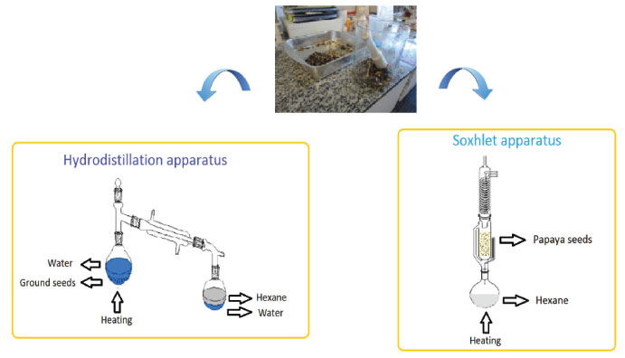 EXPERIMENTAL SECTION The laboratory experiment described here was idealized to run in two periods of 4h (totalizing 8 h) and was adapted from Aguiar and co-workers31 within the constraints of the laboratory setting. Full details can be found in the Supplementary Material. Prelab and Postlab activities The experiment was successfully applied to more advanced students (3-year undergraduate students) divided in 3 groups. Aiming for a successful experiment, we considered important that the students would be familiar with the basic theory of characterization of organic compounds (1H NMR and chromatography) and aspects related to basicity and nucleophilicity. Before and after the experiment, students were evaluated in the form of exercises. The pedagogical material is provided in the Supplementary Material. Procedures Experiment 1: Extraction of BITC from papaya seeds The initial experiment consisted on the careful extraction of BITC from the wasted papaya seeds (See details in Supplementary Material). The methodologies employed here were the hydrodistillation and the continuous extraction mode (Soxhlet) as a way to compare the efficiency of both ones (Scheme 5). To each group was given approximately 140 g material (cold fresh seeds) obtained from 4 fruits.