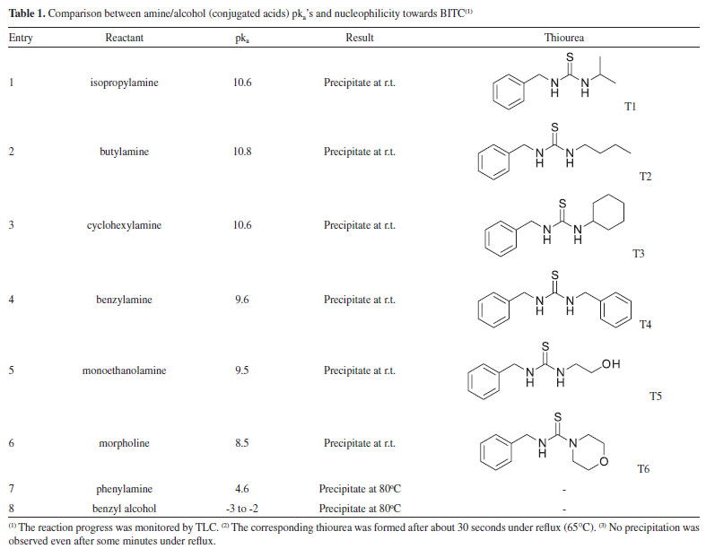 In the second part of the organic lab, students were introduced to the qualitative tests with amines and BITC. They were encouraged to anticipate and comment the results. The observation of different reactivity patterns shed a light on the nucleophilicity concept as a key pedagogical component of this experiment. According to the visual progress of the reactions (white precipitate) along with TLC analysis, BITC was completely consumed when using benzylamine, butylamine, cyclohexylamine, isopropylamine, monoethanolamine and morpholine as nucleophiles (Scheme 7 and Figure 2). The students confirmed which amines are nucleophilic and indicated whether the expected trend were correctly displayed. The spectra of the corresponding thioureas can be found in the Supplementary Material. Aniline was not able to react under this mild condition although the reaction appeared to be limited to the temperature, since precipitation occurred immediately after reflux. However, EWG-substituted anilines (e.g. 4-nitroaniline) and alcohols remained unreactive even under high temperature conditions thus evidencing a low nucleophilicity towards the isothiocyanate. To explain and engage students about some of the differences in results, the examination of what factors make a good nucleophile was the first goal. It should be noted that most students invoked the acid conjugated pka's to rationalize the results they observed. Since basicity (Table 1) is associated with thermodynamics while nucleophilicity is related to the kinetic behavior, the illustration of definitions along with how the terms can be used in different contexts was instructional. However, even though the results evidenced that the nucleophilicity of the different amines are in line with their conjugated acid pka values - which are in the range of 10 (isopropylamine) to 8.5 (morpholine)34-nucleophilicities are not easily correlated with basicities. Mostly, predictions should be pointed out only if structural features in the immediate vicinity of the nucleophilic atom are similar. Regarding the phenylamine (aniline), this point requires the understanding of the electronic effects because the presence of electron-withdrawing groups can decrease the electron density on the reaction site. Indeed, concerning the expected result involving benzyl alcohol, the comparison with benzyl amine is illustrative to stablish a parallelism about the atom tendency to form new covalent bonds by sharing their electron pairs. Thus, two factors contribute to the observed reactivity. Indeed, we believe that drawing analogies with the Pearson's SHAB (Soft Hard Acid Base) approach greatly broadens the subject perspective having in mind the qualitative concept. Just as with pka and pkb scales for Brønsted acids and bases, we hope that the building of nucleophilicity scales based upon relative reactivities in common organic reactions can stimulate comprehensive studies of analogous systems.35 Thus, these simple examples allow for an introductory discussion of the many important aspects related to physical organic chemistry and are desirable in the predictions of mechanistic studies of more complex reactions.