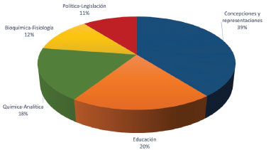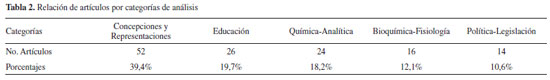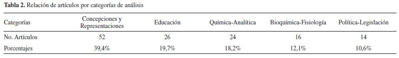 La clasificación inicial arrojó 121 artículos, organizados a partir de los siguientes datos: título, autor, revista, país, año de publicación, resumen, resultados y conclusiones. Al respecto, emergen cinco categorías: Química-Analítica; Bioquímica-Fisiología; Concepciones-Representaciones; Educación; Política-Legislación (Figura 1). Los datos fueron sistematizados, registrados en tablas y analizados para su posterior discusión con base en las preguntas formuladas.