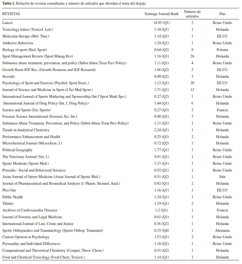 METODOLOGÍA A lo largo de la presente investigación se consultó la base de datos multidisciplinaria Science Direct (Elsevier), por ser la que alberga una cuarta parte del contenido mundial de revistas y libros en texto completo, además de ser una de las mayores fuentes de información para la investigación científica, técnica y médica. La revisión en un período de tiempo de 20 años, proporcionó 176 registros ante el término inductor "doping". A partir de una revisión exhaustiva se escogieron aquellos artículos que evidenciaron un índice de impacto alto según el Scimago Journal Rank (SJR), obteniendo una muestra de 121 artículos ubicados en uno de los cuartiles del SJR, lo que se traduce en una revisión de 36 revistas especializadas (Tabla 1). Esta producción se categorizó siguiendo los principios de la investigación cualitativa, particularmente el enfoque metodológico del estado del arte, el cual consiste en "inventariar y sistematizar la producción en determinada área de conocimiento. Pero también es una de las modalidades cualitativas de "investigación de la investigación" que busca sistematizar los trabajos realizados dentro de un área dada, se realiza una revisión de fuentes y documentos, para cumplir con un nivel descriptivo" (p. 32).16