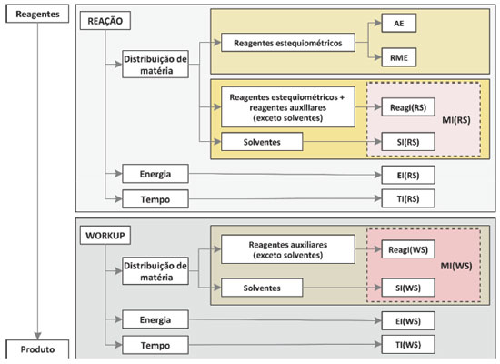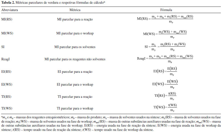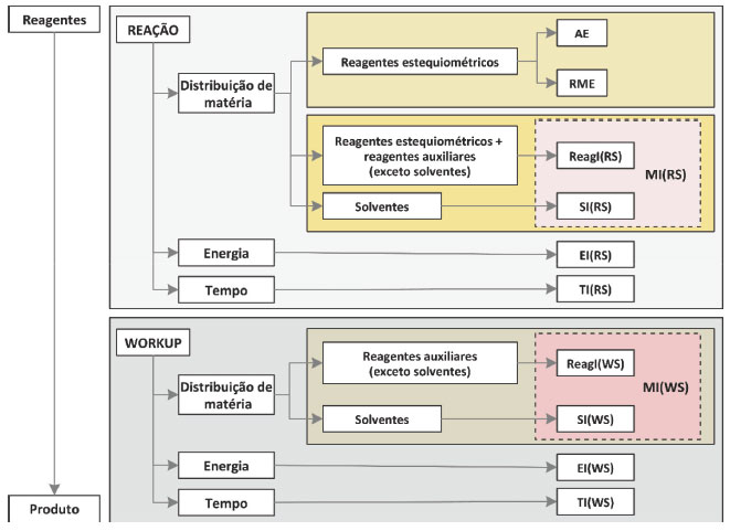 As métricas MI, EI e TI são normalizadas para o produto, i. e., calculadas como uma razão para a unidade de massa do produto (denominador), em que o numerador é uma soma de parcelas (de massas, energias ou tempo) que se referem separadamente às duas fase do processo global; portanto, podem ser parceladas para a reação e o workup, por exemplo, MI = MI(RS) + MI(WS), em que RS e WS resultam das designações inglesas "reaction step" e "workup step".54Essas métricas parcelares proporcionam informação sobre o contributo das massas, da energia e do tempo envolvidos em cada fase, para o valor global da métrica respetiva e, portanto, na verdura global. Para as métricas de massa, pode fazer-se também uma outra parcelização para calcular métricas que descriminem solventes e reagentes e forneçam informação detalhada sobre o modo como as respetivas massas afetam a verdura mássica global, por exemplo, MI = SI + ReagI, em que SI se refere aos solventes e ReagI aos reagentes estequiométricos e a todos os reagentes auxiliares não solventes. Na Tabela 2 listam-se as métricas parcelares usadas neste trabalho e na Figura 3 apresenta-se uma visão global da utilização da bateria de métricas descrita, constituída por Figura 22S do Material Suplementar, em que se apresentam esquemas métricas globais e parcelares, que mostra como obter uma descrição das relações entre as métricas usadas para o caso particular da síntese detalhada das verduras de massa e de energia, bem como da utilização realizada neste trabalho, em que na fase de reação não se usaram do tempo, para o processo de síntese. Esta figura é suplementada pela solventes (ver adiante).