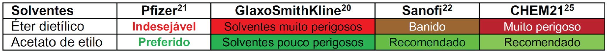A quantidade de energia elétrica usada e o tempo utilizado, quer para a reação (foi utilizada uma manta de aquecimento com agitação magnética), quer para o workup (usou-se um evaporador rotativo com uma bomba de vácuo e um sistema de refrigeração), foram medidos em todas as experiências com um aparelho PeakTech 2510. A pureza do produto obtido pelos protocolos B e C foi avaliada por 1H RMN. Os resultados mostram que a pureza das amostras obtidas por ambos esses protocolos foi elevada e semelhante. Os espetros obtidos foram ainda comparados com o espetro de uma amostra comercial do LI obtida da Sigma-Aldrich (ref. 87929), que mostrou que a pureza dos produtos obtidos pelos protocolos B e C é similar à dessa amostra. Um roadmap com os principais detalhes da estratégia seguida no trabalho experimental é apresentado no Material Suplementar, bem como os pormenores dos protocolos, apresentando-se a seguir apenas alguns comentários sobre as substituições de solventes. Protocolo A - Nesse protocolo54 a remoção completa da água do produto mostrou-se difícil: após 6 horas no evaporador rotativo, 13 g de água, ou 65% da água adicionada (20 g), ainda permaneciam em 41 g de LI final bruto. Como aumentar o tempo de evaporação iria piorar as métricas de energia, a água não pode ser considerada um solvente eficiente para o processo da síntese, pelo que se decidiu eliminar o seu uso no protocolo B. Protocolo B - Na ausência de água, a viscosidade do produto bruto aumentou, mas obteve-se um produto de maior pureza (ver espetros de 1H RMN, Material Suplementar, Figuras 8S, 11S, 12S e 15S). O tempo e a energia usados no evaporador rotativo diminuíram acentuadamente em relação ao protocolo A (6 h para 12 min e 4500 Wh para 81 Wh, respetivamente). No entanto, o uso de éter dietílico é inseguro, devido à sua elevada volatilidade e perigos para a saúde, pelo que se decidiu substituí-lo por uma alternativa mais benigna no protocolo C. Protocolo C - Após análise de perigosidade dos solventes através de guias de seleção e das ferramentas EHS e SHE (ver seção seguinte), optou-se pelo acetato de etilo. A pureza do produto manteve-se elevada (ver espetros de 1H RMN, Material Suplementar, Figuras 9S, 11S, 3S e 15S), mas a energia e o tempo utilizados no evaporador rotativo aumentaram, porque o acetato de etilo é menos volátil que o éter dietílico (p.e. 77 ºC vs. 34,6 ºC, respetivamente).