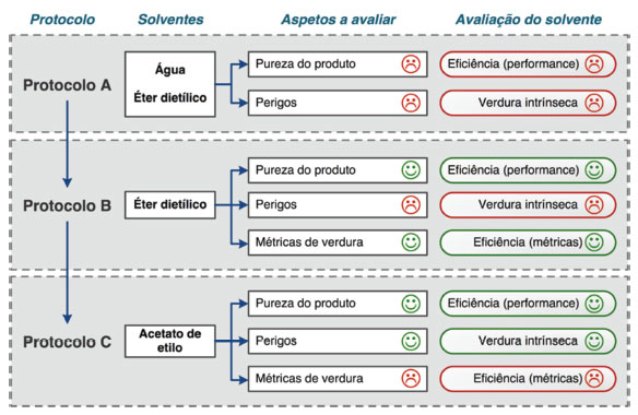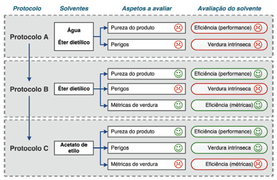 O cálculo das métricas de energia e de tempo permitiu investigar como os solventes afetam essas componentes da verdura e testar a consistência global na utilização das métricas. As métricas EI e a TI (Tabela 3) foram calculadas a partir dos resultados da medição das duas grandezas. Os valores de TI para os protocolos B e C são similares, mas o valor de EI aumenta 20% de B para C. Como a EI é maior no protocolo C, a opção mais verde em termos de utilização de energia será o primeiro protocolo (solvente: éter dietílico), em concordância com o que foi discutido acima para os resultados das métricas de massa. O cálculo das métricas parcelares de energia e tempo para a reação e workup permite analisar mais aprofundadamente as contribuições individuais das duas etapas nas métricas e, em particular, explicar as diferenças nos valores de EI e TI para os dois protocolos, nomeadamente o aumento de EI de B para C, enquanto TI se mantém. Os valores de EI(RS) e EI(WS) e de TI(RS) e TI(WS) são apresentados nas Figuras 8B e 8C, respetivamente. As intensidades de energia e de tempo para a fase de reação (EI(RS) e TI(RS), respetivamente) foram semelhantes para ambos os protocolos (respetivamente, 5,62 e 5,73, ver Figura 8B; e 10,00 e 10,13, Figura 8C), o que está de acordo com o procedimento da fase de reação ser o mesmo e a alteração de solvente não ter efeito na sua eficiência, conforme discutido atrás na subsecção "Avaliação do efeito na performance." Contudo, para o workup, as intensidades de energia, EI(WS), e de tempo, TI(WS), foram maiores para o protocolo C do que para o protocolo B (respetivamente 3,72 e 2,24 Wh g-1 (ver a Figura 8B); e 0,28 e 0,46 min g-1 Figura 8C). Isso é consequência da diferença de volatilidades dos solventes: como o acetato de etilo (protocolo C) é menos volátil que o éter dietílico (protocolo B), requer mais tempo (ca. mais 65%) para a evaporação, o que significa mais energia por unidade de massa de produto (ca. mais 66%) consumida nesta operação. Os valores das variações do protocolo B para C na Figura 8 mostram aumentos semelhantes de EI (9,45 - 7,87 = 1,58 Wh g-1) e EI(WS) (3,72 - 2,24 = 1,48 Wh g-1), comprovando que o workup é o responsável pela diferença de energia utilizada. Em suma, é a diferença de volatilidades dos solventes usados no workup que explica o aumento do EI em 20% do protocolo B para o C (ver Tabela 3). Quanto à TI(WS), aumenta de B para C na mesma proporção que EI(WS) (cerca de 65%), mas como o tempo gasto no workup é muito menor que o de reação (Figura 8C), a variação na métrica global TI é baixa, passando quase despercebida. Em conclusão, o cálculo e análise de métricas parcelares mostram-se úteis quer para aprofundar o conhecimento sobre a materialização e a energização dos processos de síntese, quer para comprovar a fiabilidade dos valores das métricas. Finalmente, embora seja lateral ao tema deste trabalho, é interessante notar que as métricas de massa parcelares calculadas para esta síntese confirmam resultados anteriores, obtidos pela avaliação da verdura de várias outras sínteses,40,61 que mostraram que a contribuição da verdura da fase de workup é frequentemente mais penalizadora para a verdura mássica global do processo de síntese do que a da fase de reação. No entanto, no presente caso, isso pode resultar principalmente da ausência de solvente na fase de reação. Por outro lado, as métricas de energia parcelares mostram o oposto: para a reação usa-se duas vezes mais energia do que no workup. Resumo da avaliação A Figura 9 sumariza o procedimento de avaliação dos solventes na síntese estudada, proporcionando um panorama global dos resultados obtidos quanto aos seus efeitos na segurança, eficiência e verdura do processo. Essa sumarização gráfica dos resultados evidencia bem a complexidade da substituição dos solventes com vista a otimizar a segurança e verdura do processo de síntese. No presente caso, a substituição conduziu a uma contradição: embora a eficiência da reação de síntese não seja influenciada pelos solventes usados, o solvente mais seguro (acetato de etilo, protocolo C) proporciona piores métricas de verdura, sendo o solvente mais perigoso (éter dietílico, protocolo B) o que permite maior verdura do processo - melhores métricas de desmaterialização e desenergização (ver a Tabela 3).