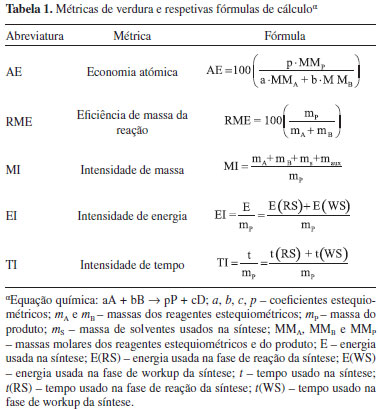 Quanto à primeira avaliação, a verdura intrínseca do solvente é independente do seu uso na síntese, dependendo apenas das propriedades caraterísticas do solvente, e pode ser avaliada com vários instrumentos, como já referido: guias de seleção de solventes,19-27 a ferramenta EHS,33 ou a ferramenta SHE.35A escolha do instrumento depende do contexto, por exemplo, no ensino a níveis pré-universitários pode ser utilizada a ferramenta SHE, mais simples, mas a níveis superiores podem ser também utilizados os guias de seleção de solventes e a ferramenta EHS. Apesar da verdura intrínseca dos solventes ser um aspeto importante para avaliar a segurança e o impacto ambiental resultante da sua utilização, para aferir a verdura global de um solvente num processo de síntese é também necessário ter em conta dois aspetos do seu comportamento: primeiro, a influência do solvente na eficiência do processo, isso é, se possibilita a obtenção do produto com elevado rendimento e qualidade; e, segundo, o impacto do solvente na verdura global do processo, isso é, se suporta a implementação de um processo verde, apreciado por métricas de verdura. Assim, são requeridas duas componentes de avaliação dirigidas ao cumprimento desses dois objetivos: uma dirigida à eficiência do solvente, que depende do impacto do seu uso na performance da síntese (aferida pelos valores do rendimento e pureza do produto obtido); e outra referente à verdura da síntese (avaliada pelos valores das métricas de uma bateria que permite a aferição de várias componentes da verdura). Essas duas avaliações paralelas dos efeitos do solvente no processo previnem danos colaterais do uso de solventes escolhidos por serem intrinsecamente benignos, já que um solvente escolhido por ser menos perigoso pode conduzir a um produto final contaminado com impurezas, incluindo resíduos do próprio solvente, e/ou implicar deterioração da verdura global do processo. Por isso, avaliar a eficiência do solvente, para além do cálculo do rendimento e do estudo da pureza, requer o cálculo de métricas de verdura para o processo de síntese global, com o fim de aferir aspetos da síntese influenciados diretamente pelo uso de solventes.45-49Por exemplo, para suportar comparações quando solventes alternativos são experimentados numa síntese com vista a otimizar a sua verdura, o bom aproveitamento dos átomos dos reagentes e a quantidade de resíduos produzidos devem ser avaliados por métricas de massa específicas. Bateria de métricas A bateria de métricas utilizada neste trabalho fornece informação separada sobre as verduras mássica, energética e de tempo do processo de síntese, bem como sobre as contribuições das diferentes componentes da verdura mássica (no uso dos solventes, no caso presente), proporcionando uma visão holística da verdura do processo. No quadro de pensamento sistémico, uma bateria de métricas é um conjunto de métricas que funcionam como um todo, constituindo um sistema de avaliação que, acoplado ao sistema em estudo, permite obter informação sobre ele; as métricas da bateria são criteriosamente escolhidas para captar informação sobre as variáveis do sistema que influenciam o seu funcionamento, sendo por isso relevantes para a gestão do sistema.45-49 O conjunto de métricas selecionadas para constituir o sistema de avaliação varia o com problema em análise, conforme a informação que se pretende captar. A bateria de métricas usada no caso presente, além das métricas de massa "clássicas" para o processo de síntese global (AE, RME e MI), inclui também métricas de energia (EI)50-53e de tempo (TI)51,52(Tabela 1). A medição de energia utilizada na síntese laboratorial (raramente é incluída em experiências de síntese,50-53 sendo normalmente negligenciada em laboratório, mas permite o cálculo de métricas de energia para avaliações da verdura energética; além disso, permite aos estudantes tomar consciência da importância desta variável na atividade industrial da química.51,52