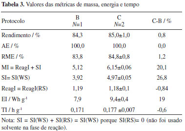Discussão sumativa das três avaliações Embora as três avaliações apontem para o mesmo resultado, com vantagem do acetato de etilo, a sua concordância não é absoluta, o que resulta da diferente natureza e/ou de detalhes nos critérios que usam, um aspeto que poderá servir para fazer sentir aos estudantes as dificuldades da tarefa de aferir os perigos potenciais das substâncias químicas, devido à sua complexidade. Avaliação do efeito dos solventes na performance e verdura da síntese Os valores dos rendimentos obtidos bem como das métricas de verdura de massa, energia e tempo, para as sínteses realizadas pelos protocolos B e C, são apresentadas na Tabela 3. Na última coluna apresentam-se as diferenças dos valores das métricas (em percentagem, relativamente a B), para facilitar a comparação.