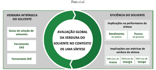 A COMPLEXIDADE DA AVALIAÇÃO GLOBAL DOS EFEITOS DOS SOLVENTES NA VERDURA DAS SÍNTESES Dada a omnipresença de solventes nos processos de síntese (ver a Figura 1), a avaliação do modo como os solventes escolhidos influenciam a verdura do processo é complexa, já que frequentemente são usados vários solventes nas duas fases da síntese (reação e workup) para cumprimento de funções distintas. Além disso, o solvente usado na fase de reação como meio reacional influencia em muitos casos o mecanismo de avanço da reação e a qualidade do produto obtido. Em consequência, a avaliação global da verdura dos solventes em sínteses requer três avaliações paralelas, dirigidas a: (i) verdura intrínseca dos solventes, para obter a maior benignidade possível quanto aos aspetos SHE; (ii) implicações dos solventes na pureza do produto e rendimento da síntese; e (iii) efeitos dos solventes na verdura global do processo de síntese, avaliados por métricas de verdura (ver o esquema na Figura 2).