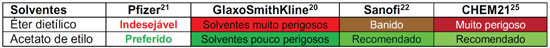 REFERÊNCIAS 1. Marcus, Y.; The Properties of Solvents, 3ª ed., Wiley: Hoboken, 1998. 2. Reichardt, C.; Solvents and Solvent Effects in Organic Chemistry, 3ª ed., Wiley-VCH: Hoboken, 2003. 3. Pena-Pereira, F.; Tobiszewski, M.; The Application of Green Solvents in Separation Processes. 2ª ed., Elsevier: Amsterdam, 2017. 4. Clark, J. H.; Hunt, A. J.; Topi, C.; Paggiola, G.; Sherwood, J.; Sustainable Solvents - Perspectives from Research, 2ª ed., Business and International Policy, RSC: London 2017. 5. Kerton, F. M.; Marriott, R.; Alternative Solvents for Green Chemistry, 2ª ed., RSC: London, 2013. 6. Nelson, W. M.; Green Solvents for Chemistry - Perspectives and Practice, 3ª ed., Oxford University Press: Oxford, 2003. 7. Dicks, A. P.; Green Organic Chemistry in Lecture and Laboratory, 1ª ed., CRC Press: Boca Raton, 2016. 8. Poliakoff, M.; Licence, P.; Nature 2007, 450, 810. 9. Jessop, P. G.; Can. Chem. News 2007, 59, 16. 10. Jiménez-González, C.; Curzons, A. D.; Constable, D. J. C.; Cunningham, V. L.; Int. J. Life Cycle Assess. 2004, 9, 114. 11. Constable, D. J. C.; Jimenez-Gonzalez, C.; Henderson, R. K.; Org. Process Res. Dev. 2007, 11, 133. 12. Kerton, F. M.; Alternative Solvents for Green Chemistry, RSC: London, 2009. 13. Anastas, P. T.; Warner, J. C.; Green Chemistry: Theory and Practice, Oxford University Press: Oxford, 1998. 14. Clark, J. H.; Tavener, S. J.; Org. Process Res. Dev. 2007, 11, 149. 15. Capello, C.; Fischer, U.; Hungerbuhler, K.; Green Chem. 2007, 9, 927. 16. Capello, C.; Hellweg, S.; Badertscher, B.; Hungerbühler, K.; Environ. Sci. Technol. 2005, 39, 5885-5892. 17. https://www.ethz.ch/content/specialinterest/chab/chemical-n bioengineering/set-group/en/research/downloads/software---tools/ecosolvent.html, acessada em Agosto 2019. 18. Jessop, P. G.; Green Chem. 2011, 13, 1391. 19. Henderson, R. K.; Jimenez-Gonzalez, C.; Constable, D. J. C.; Alston, S. R.; Inglis, G. G. A.; Fisher, G.; Sherwood, J.; Binks, S. P.; Curzons, A. D.; Green Chem. 2011, 13, 854. 20. Alder, C. M.; Hayler, J. D.; Henderson, R. K.; Redman, A. M.; Shukla, L.; Shuster, L. E.; Sneddon, H. F.; Green Chem. 2016, 18, 3879. 21. Alfonsi, K.; Colberg, J.; Dunn, P. J.; Fevig, T.; Jennings, S.; Johnson, T. A.; Kleine, H. P.; Knight, C.; Nagy, M. A.; Perry, D. A.; Stefaniak, M.; Green Chem. 2008, 10, 31. 22. Prat, D.; Pardigon, O.; Flemming, H.-W.; Letestu, S.; Ducandas, V.; Isnard, P.; Guntrum, E.; Senac, T.; Ruisseau, S.; Cruciani, P.; Hosek, P.; Org. Process Res. Dev. 2013, 17, 1517. 23. Diorazio, L. J.; Hose, D. R. J.; Adlington, N. K.; Org. Process Res. Dev. 2016, 20, 760. 24. http://www.acs.org/content/dam/acsorg/greenchemistry/industriainnovation/roundtable/acs-gci-pr-solvent-selection-guide.pdf, acessada em Agosto 2019. 25. https://www.chem21.eu/project/chem21-solvent-selection-guide/, acessada em Agosto 2019. 26. Prat, D.; Wells, A.; Hayler, J.; Sneddon, H.; McElroy, C. R.; Abou-Shehada, S.; Dunn, P. J.; Green Chem. 2016, 18, 288. 27. Prat, D.; Wells, A.; Hayler, J.; Sneddon, H.; McElroy, C. R.; Abou-Shehada, S.; Dunn, P. J.; Green Chem. 2015, 17, 4848. 28. http://www.imi.europa.eu, acessada em Agosto 2019. 29. Prat, D.; Hayler, J.; Wells, A.; Green Chem. 2014, 16, 4546. 30. Perez-Vega, S.; Ortega-Rivas, E.; Salmeron-Ochoa, I.; Sharratt, P. N.; Environment, Development and Sustainability 2013, 15, 1. 31. Alves Costa Pacheco, A.; Sherwood, J.; Zhenova, A.; McElroy, C. R.; Hunt, A. J.; Parker, H. L.; Farmer, T. J.; Constantinou, A.; De Bruyn, M.; Whitwood, A. C.; Raverty, W.; Clark, J. H.; ChemSusChem 2016, 9, 3503. 32. Murray, P. M.; Bellany, F.; Benhamou, L.; Bucar, D. K.; Tabor, A. B.; Sheppard, T. D.; Org. Biomol. Chem. 2016, 14, 2373. 33. Koller, G.; Fischer, U.; Hungerbühler, K.; Ind. Eng. Chem. Res. 2000, 39, 960. 34. https://www.ethz.ch/content/specialinterest/chab/chemical-n bioengineering/set-group/en/research/downloads/software---tools/ehs tool.html, acessada em Agosto 2019. 35. Pinto, J. R. M.; Ribeiro, M. G. T. C.; Machado, A. A. S. C.; Química - Boletim da S. P. Q. 2017, 146, 175-186. 36. McKenzie, L. C.; Huffman, L. M.; Hutchison, J. E.; Rogers, C. E.; Goodwin, T. E.; Spessard, G. O.; J. Chem. Educ. 2009, 86, 488. 37. Aktoudianakis, E.; Chan, E.; Edward, A. R.; Jarosz, I.; Lee, V.; Mui, L.; Thatipamala, S. S.; Dicks, A. P.; J. Chem. Educ. 2009, 86, 730. 38. Dicks, A. P.; Green Chem. Lett. Rev. 2009, 2, 87. 39. Dicks, A. P.; Green Chem. Lett. Rev. 2009, 2, 9. 40. Duarte, R. C. C.; Ribeiro, M. G. T. C.; Machado, A. A. S. C.; J. Chem. Educ. 2015, 92, 1024. 41. Soares, P.; Fernandes, C.; Chavarria, D.; Borges, F.; J. Chem. Educ. 2015, 92, 575. 42. Dicks, A. P.; J. Chem. Educ. 2015, 92, 405. 43. Mistry, N.; Fitzpatrick, C.; Gorman, S.; J. Chem. Educ. 2016, 93, 1091. 44. Goodwin, T. E.; J. Chem. Educ. 2004, 81, 1187. 45. Machado, A. A. S. C.; Quim. Nova 2014, 37, 1094. 46. Machado, A. A. S. C.; Introdução às Métricas da Química Verde - Uma visão sistêmica, EdUFSC: Florianópolis, 2014. 47. Machado, A. A. S. C. In Worldwide Trends in Green Chemistry Education; Zuin, V., Mammino, L., eds.; RSC: London, 2015, pp 111-136. 48. Committee on Metrics for Global Change Research (CMGCR) - US National Research Council, Thinking Strategically - The Appropriate Use of Metrics for the Climate Change Science Program. US National Academy Press: 2005, disponível em: http://www.nap.edu/catalog.php?record_id=11292, acessado em Agosto 2019. 49. Committee on Industrial Environmental Performance Metrics (CIEPM) - US Academy of Engineering, Industrial Environmental Performance Metrics - Challenges and Opportunities. US National Academy Press: 1999, disponível em: http://www.nap.edu/catalog.php?record_id=9458, acessado em Agosto 2019. 50. Calvo-Flores, F. G.; ChemSusChem 2009, 2, 905. 51. Borges, M. J.; Ribeiro, M. G. T. C.; Machado, A. A. S. C.; XVIII Encontro Luso-Galego de Química, Vila Real, 2012; pp. 209, disponível em http://educa.fc.up.pt/investigacao_artigo.php?id=135, acessado em Agosto 20