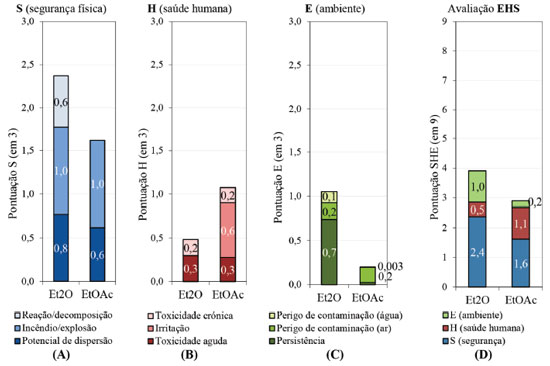 Ferramenta EHS Essa ferramenta33 de avaliação de substâncias foi concebida para ser usada na identificação dos perigos nas etapas precoces do desenvolvimento de processos químicos.15,33A ferramenta foi construída numa folha de cálculo Excel,15 a partir de informação recolhida de várias bases de dados acerca dos perigos das substâncias, cerca de cem, principalmente solventes orgânicos. Essas são avaliadas mediante três indicadores, um por cada componente SHE,15 com base em nove categorias, três para cada componente.15,33A cada categoria são atribuídas pontuações com valores entre 0 e 1; a pontuação de cada indicador SHE é a soma da pontuação das respetivas categorias, um valor entre 0 e 3.A pontuação global é obtida por soma das pontuações dos três indicadores SHE, tendo um valor entre 0 e 9. Em todas essas pontuações, o valor é tanto mais elevado quanto mais perigosa for a substância. Os resultados são apresentados numa tabela detalhada com as pontuações atribuídas a cada categoria e componente. Os resultados da comparação dos solventes alternativos éter dietílico e acetato de etilo, apresentados na Figura 6, sugerem que o acetato de etilo é menos perigoso que o éter dietílico, confirmando a informação recolhida nos guias de solvente, mas com mais detalhes sobre os perigos. No que respeita à segurança física (Figura 6A), a principal diferença é a pontuação para a categoria reação/decomposição, onde o éter dietílico tem maior pontuação que o acetato de etilo (0,60 vs. 0,00). Contudo, o acetato de etilo é mais perigoso para a saúde humana, principalmente devido à elevada pontuação na categoria irritação dérmica e ocular33 (0,63 vs. 0,00); as pontuações para as outras duas categorias (toxicidade aguda e toxicidade crónica) são semelhantes (Figura 6B). A pontuação mais elevada para o ambiente foi encontrada para o éter dietílico, devido às pontuações para a persistência (0,74) e perigo de contaminação da água (0,13), superiores às do acetato de etilo (Figura 6C). Os resultados globais (Figura 6D) evidenciam que o éter dietílico tem pontuações mais elevadas quanto à perigosidade física (2,37 vs. 1,62) e ao ambiente (1,0 vs. 0,2), mas é vantajoso quanto à saúde humana (0,5 vs. 1,1).