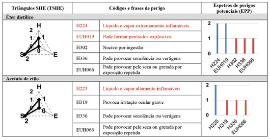Em suma, os dados da avaliação com a ferramenta EHS confirmam a vantagem do acetato de etilo, cuja pontuação global é 35% mais elevada (2,90 vs. 3,90 para o éter dietílico), embora a vantagem pareça ser menos nítida do que a obtida com os guias de solventes, todos também mais favoráveis ao acetato de etilo (ver Figura 5). No entanto, essa comparação é problemática, porque as avaliações são de natureza diferente, semiquantitativa na ferramenta EHS e qualitativa nos guias; além disso, a diferente linguagem usada na classificação dos solventes nos diferentes guias acarreta ambiguidades. Ferramenta SHE Nessa ferramenta,35,56,57 os perigos das substâncias, obtidos das respetivas SDS, após pontuação numa escala de 0 (perigo baixo) a 2 (perigo elevado), são apresentados em gráficos que permitam obter uma visão global dos mesmos. Os resultados para os dois solventes são apresentados na Figura 7 (ver detalhes da construção nas referências 58 e 59). Os triângulos SHE (TSHE) são idênticos, sugerindo que as perigosidades globais são aproximadamente do mesmo nível. Os espetros de perigos potenciais (EPP), porém, apresentam diferenças, embora alguns se repitam em ambos (H336, EUH066): ocorre uma diferença nas inflamabilidades (o H224 do éter dietílico é mais penalizante que o H225 do acetato de etilo), mas não é captada pela ferramenta devido a falta de sensibilidade da escala de pontuação; e o éter dietílico apresenta mais um perigo físico elevado (EUH019). Esses resultados mostram que o acetato de etilo é mais benigno do que o éter dietílico, confirmando os obtidos nas avaliações anteriores.