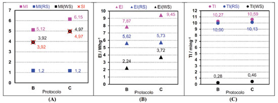 Figura 8. (A) Intensidades de massa para os protocolos B e C: processo global, MI, fases de reação, MI(RS) e de workup, MI(WS), e solventes, SI; (B) Intensidade de energia para os protocolos B e C: processo global, EI, fases de reação, EI(RS) e de workup, EI(WS) (C) Intensidade de tempo para os protocolos B e C: processo global, TI, fases de reação, TI(RS) e de workup, TI(WS)