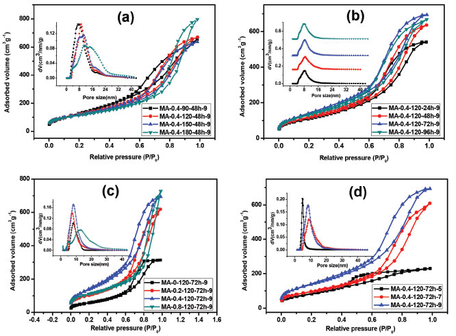 Figure 2. Nitrogen sorption isotherms and pore size distributions curves of samples synthesized under different conditions