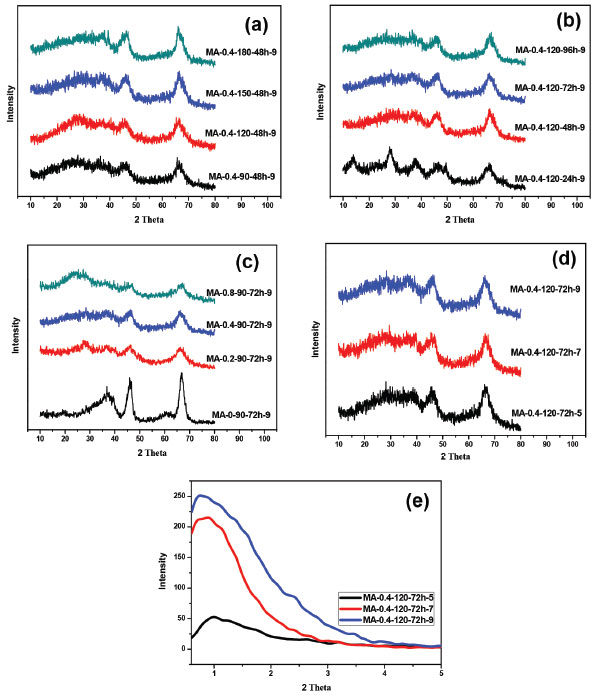 Figure 3. Wide angle XRD patters of samples synthesized under different conditions (a, b, c, d) and Small angle XRD patterns of samples synthesized at different pH (e)