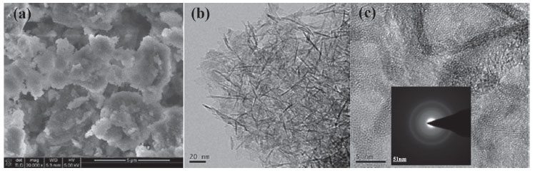 Electron microscopy (SEM, TEM and SAED image analysis) SEM, TEM and SAED images of MA-120-72h-9 are illustrated in Figure 4. As can be seen clearly in Figure 3a, the obtained γ-alumina exhibited a bulk-shaped morphology and its surface is covered with many irregular nanoparticles. Many bulk structures are overlapped and interconnected with each other and therefore generated many pore structures, the reason for this phenomenon may be that the pore structures were occupied by water during the polymerization process. The TEM image (Figure 4b) shows a scaffold structure consisting of a mixture of rod-like structures and thin sheets, with most of the rods having a length of 30-40 nm and a width of 2-3 nm. This illustrates that the porous structure arose from the interlacing of the rods. The HRTEM images (Figure 4c) show that the lattice fringes of γ-alumina are clearly resolved, indicating the crystallization of the material. The SAED pattern inserted in Figure 4c shows bright diffraction rings, further confirming the crystalline structure exhibits polycrystalline feature of this material.